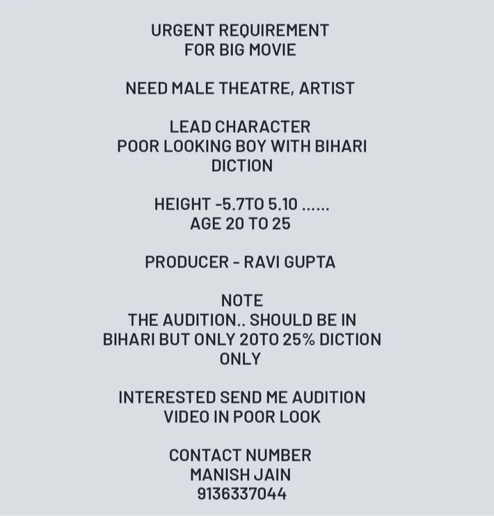If interested pls share 1 intro video mention rizta sudition available on 7977246090.